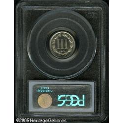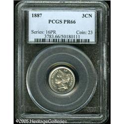 <B>1887 3CN PR66 PCGS.</B></I> Brilliant over each side with a slight amount of contrast present, the fields are especially deep in their mirrored reflectivity. This strong reflectivity is obviously from heavy die polishing, as evidenced by the incomplete ribbon ends on the lower reverse. Lot:5827