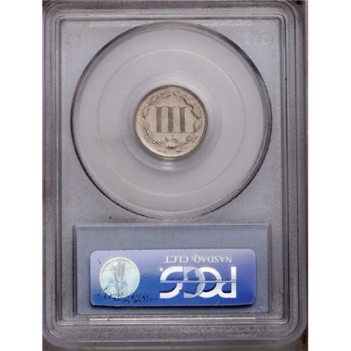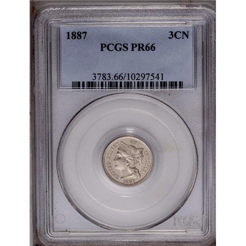 <B>1887<3CN> PR66 PCGS.</B></I> Sharply struck with glittering untoned surfaces whose only apparent flaw is a shallow planchet depression that resides between the first and second columns of the Roman numeral III, near the reverse center. A beautiful, sparkling Premium Gem. Population: 32 in 66, 0 finer (5/06).