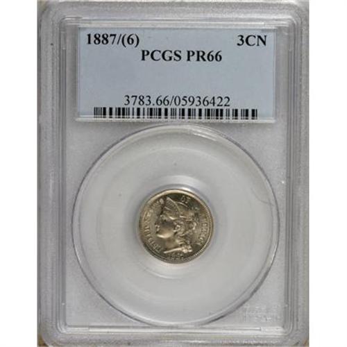 <B>1887(6) 3CN PR66 PCGS.</B></I> Die-linked to the overdate, but there is no evidence of the 6 underdigit. Sharply defined, befitting a proof strike, with light golden-tan color visible under magnification. Well preserved throughout.<BR><BR><B>Coin Engraver:</B> James B. Longacre<BR><BR><b>Shipping:</b> Coins & Currency (<a target="_blank" href="http://www.heritageauctions.com/common/shipping.php">view shipping information</a>)