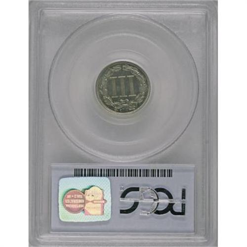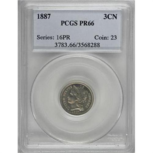 <B>1887 3CN PR66 PCGS.</B></I> The striking detail is even and complete on both sides. Essentially untoned except for faint terra cotta toning specks on each side. A trivial mark extends vertically through the left reverse field, between the wreath and the first I in the denomination. Population: 35 in 66, 0 finer (10/07). <BR><BR><B>Coin Engraver:</B> James B. Longacre<BR><BR><b>Shipping:</b> Coins & Currency (<a target="_blank" href="http://www.heritageauctions.com/common/shipping.php">view shipping information</a>)
