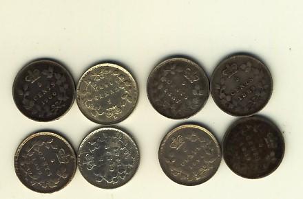 1887 5¢, 1889(3), 1892, 1894 & 1900 Rd 0(2). Lot of 8 coins all F+ to VF.