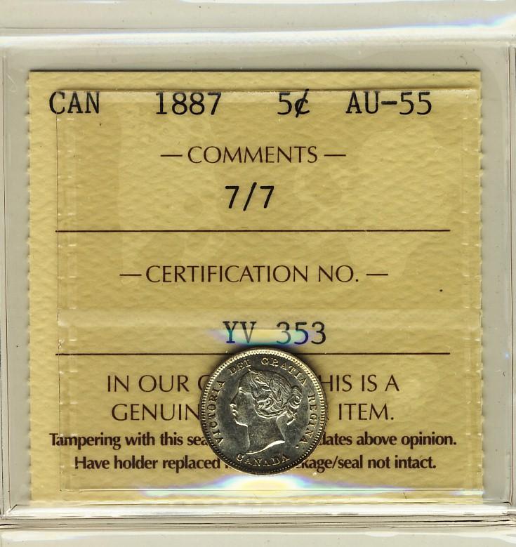 1887 5¢ 7/7 ICCS AU55. Nice lustrous issue.