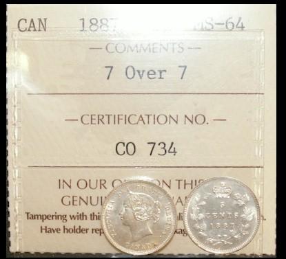 1887 5¢ 7 over 7 ICCS MS64PQ. Wow! Wow! An amazing Victoria five cent silver example. Excellent strike with clean fields and great surfaces. Fully brilliant and lustrous. The nicest example ever handled by TCNC. Possibly the finest known! Extremely rare!