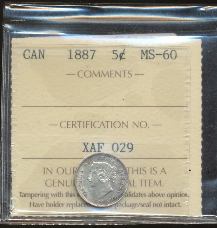 1887 5¢ ICCS MS60. Lustrous. Scarce date.