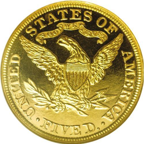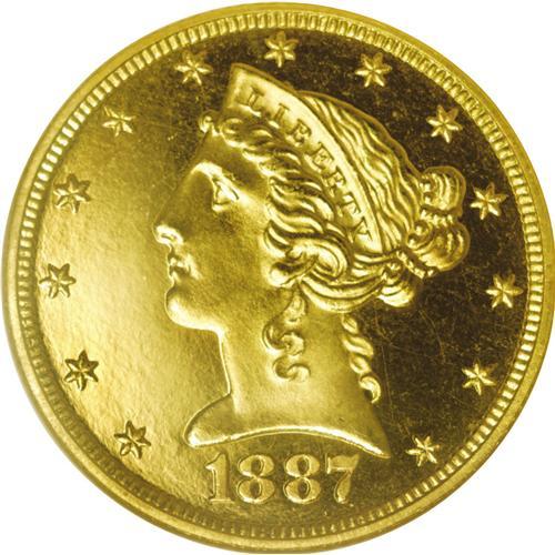 <B>1887 $5 PR65 Cameo PCGS.</B></I> The double eagle series has three proof-only dates, the 1883, 1884, and 1887. The three dollar series has two proof-only dates, the 1875 and 1876. But there is only a single proof-only half eagle date, the 1887. Considering that the San Francisco Mint struck more than five million half eagles between 1886 and 1887, demand obviously existed for half eagles, but only on the West Coast. High mintages of half eagles and eagles were struck at Philadelphia between 1880 and 1882, presumably because the Treasury believed that gold coins would circulate once they achieved parity with Federal paper money. But, Easterners preferred the convenience of the Greenback, and there was apparently a surplus of gold coins at the Treasury until the early 1890s, when mintages of half eagles once more began to increase.<BR> This is a magnificent Gem with pleasing reflectivity and radiant straw-gold devices. The strike is virtually full, barely insufficient only the hair beneath the E in LIBERTY and on the eagle's fletchings. The impressive contrast and undisturbed fields combine for exquisite eye appeal. For pedigree purposes alone, we note two minuscule lintmarks near the D in UNITED, the first centered beneath the base, and the second near the northeast portion of the curve.<BR> The proof-only 1887 has a tiny mintage of 87 pieces. To put this figure into perspective, it is less than one-tenth the production of the famous proof 1895 Morgan dollar. The mintage is also less than that of the proof-only 1887 double eagle, for which 121 pieces were struck. PCGS has certified a total of 12 examples of the 1887 half eagle, but five of these are in PR55 to PR60 grades, which suggests they are impaired. At the Gem level, PCGS has certified only two pieces, a PR65 and a PR65 Cameo, with none finer. Thus, the present lot is the single finest certified PCGS 1887 half eagle, and as such, is of the greatest importance to the proof gold specialist.<BR><I>From The Dr. Robert J. Loewinger Collection.</B></I><BR><BR><b>Shipping:</b> Coin/Currency (<a target="_blank" href="http://www.heritageauctions.com/common/shipping.php">view shipping information</a>) <BR><BR><B>Important notice: