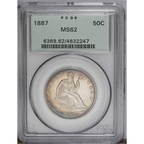 <B>1887<50C> MS62 PCGS.</B></I> This older holder Seated half is moderately prooflike, which is not surprising since the business strike production was just 5,000 pieces. Thorough evaluation locates a few trivial hairlines on the right obverse field. The borders show golden-brown, plum, and blue-green toning.<BR><I>From The Steve Glenn Collection.</B></I> <BR><BR><B>Important notice:</B> Heritage usually auctions material at the rate of 200-250 lots per hour. On some occasions eBay Live bid software or the Internet may not be able to keep up with the pace of the auction. We recommend placing a realistic absentee bid now as insurance to avoid disappointment. Occasionally the auctioneer may eliminate or reject an eBay Live bid, and the auctioneer may also reopen a lot after the close of the eBay live bidding (usually because we missed an audience bid), and may reject your bid even if it shows you as the winning bidder. By bidding via eBay Live, you agree that Heritage may award the lot to another bidder at its sole discretion under the circumstances described above or any other reasonable circumstances. Since eBay bids are not shown to us until we open the lot on the floor, we treat those bids just like floor bids. In most cases the floor responds before the eBay bid is presented to us, due to Internet lag time, so for consistency we have made it a policy that floor bids are always considered first over tie eBay live bids. Also please note that all Heritage lots purchased through eBay Live carry a 20% Buyer's Premium. Please make sure you read the Terms and Conditions before you bid. This lot is being auctioned in conjunction with a live floor auction by Heritage Galleries & Auctioneers. All final auction and invoice information will be supplied by Heritage Galleries & Auctioneers, and all other information should be considered preliminary. Lot:2026 <BR><BR><B>Winning Notification and Billing:</B> After the FINAL session in this auction is complete, Heritage will send e-mail and snail mail invoices. This process normally takes several days. All final auction and invoice information will be supplied by Heritage Galleries & Auctioneers, and all other information should be considered preliminary. <BR><BR>This auction will be conducted on a live auction floor and over the Internet through eBay Live. If you choose to place an absentee bid, please take a moment to <font color='#0000ff'><u><a href='http://pages.ebay.com/liveauctions/help/before/laabsentee.html'>learn how eBay Live absentee bidding works</a></u></font><font color='#000000'>