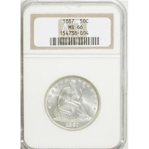 <B>1887 50C MS66 NGC.</B></I> This brilliant Premium Gem has exemplary luster and a beautifully preserved reverse. The obverse has only faint signs of contact. A good strike with minor weakness on a few stars and Liberty's hair. One of a lengthy series of ultra-low mintage dates, the 1887 has a business strike mintage of 5,000 pieces and a proof emission of 710 pieces. Census: 12 in 66, 3 finer (11/07).<BR><I>From The Parker Lee III Collection.</B></I><BR><BR><B>Coin Engraver:</B> Christian Gobrecht<BR><BR><b>Shipping:</b> Coins & Currency (<a target="_blank" href="http://www.heritageauctions.com/common/shipping.php">view shipping information</a>)