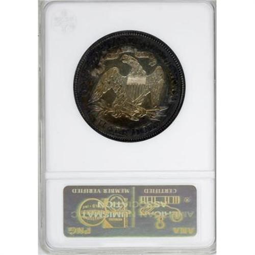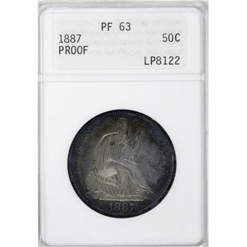 <B>1887 50C PR63 ANACS.</B></I> An elegant Select exemplar housed in a pre-Amos Press ANACS holder. The outer bands are blue-violet, while the centers are goldenrod and silver-gray. Light hairlines are present in the fields, but the overall eye appeal is solid.<BR><I>From The John Stimson, Sr. Collection, Part One.</B></I><BR><BR><B>Coin Engraver:</B> Christian Gobrecht<BR><BR><b>Shipping:</b> Coins & Currency (<a target="_blank" href="http://www.heritageauctions.com/common/shipping.php">view shipping information</a>)