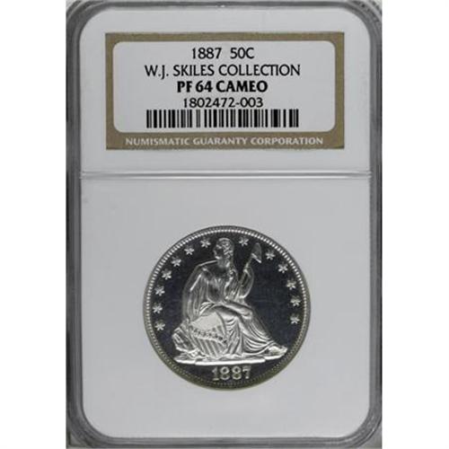 <B>1887 50C PR64 Cameo NGC.</B></I> Ex: W.J. Skiles Collection. Light gold patina endows this nicely struck and carefully preserved specimen. The devices offer imposing white-on-black contrast. Proofs and business strikes combined for a mere 5,710 pieces.<BR><I>Ex: FUN Signature (Heritage, 1/05), lot 7419, which realized $1,955.<BR>From The Mario Eller Collection, Part One.</B></I><BR><BR><b>Shipping:</b> Coins & Currency (<a target="_blank" href="http://www.heritageauctions.com/common/shipping.php">view shipping information</a>)