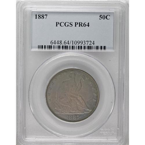 <B>1887 50C PR64 PCGS.</B></I> Deep olive-gold, blue, and violet patina largely obscures the mirrors, but the crisply detailed devices leave no doubt that this piece is a proof. A few minor hairlines on each side restrict the grade. Population: 58 in 64, 30 finer (11/06).<BR><BR><b>Shipping:</b> Coin/Currency (<a target="_blank" href="http://www.heritageauctions.com/common/shipping.php">view shipping information</a>)