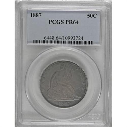 <B>1887 50C PR64 PCGS.</B></I> This deeply toned proof has thick heather, sea-green, and steel-blue toning over fully mirrored fields. The devices are frosted, presenting a pleasing cameo appearance under the toning. Population: 59 in 64, 30 finer (8/07).<I><BR>From The Beau Clerc Collection.</B></I><BR><BR><B>Coin Engraver:</B> Christian Gobrecht<BR><BR><b>Shipping:</b> Coins & Currency (<a target="_blank" href="http://www.heritageauctions.com/common/shipping.php">view shipping information</a>)