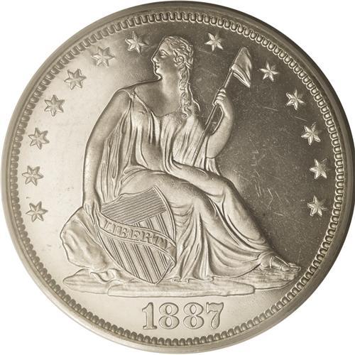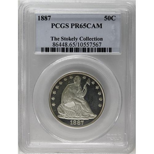 <B>1887<50C> PR65 Cameo PCGS.</B></I> The devices are pleasantly frosty, and the glassy fields have only incidental hairlines. A reasonable strike confirms the eye appeal. Just 5,000 business strikes and 710 proofs were struck, since silver dollar production took precedence during throughout the decade. Population: 11 in 65 Cameo, 1 finer (6/06).<BR><I>From The Stephen Stokely #1 PCGS Registry Set of Proof Seated Half Dollars.</B></I>