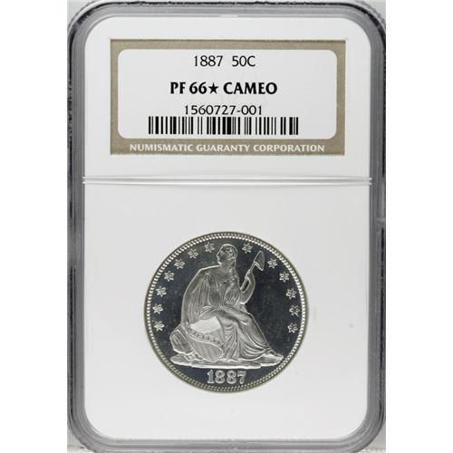 <B>1887 50C PR66 <img border='0' src='http://www.heritagecoins.com/images/star.gif' width=10 height=10> Cameo NGC.</B></I> Only 710 proofs were struck, and the business production of 5,000 pieces was also very low. This outstanding Premium Gem displays heavily frosted devices that seem to hang suspended above the bottomless, jet-black fields. No hint of post-striking contact can be found on either side. A trace of weakness on obverse stars 12 and 13, and on the eagle's lower tail feathers (possibly from die polish) seem easy to overlook in the face of such marvelous overall quality. The Star designation, only granted to one other example of this proof issue by NGC (also a PR66), is ample testament to the stunning beauty of this gorgeous specimen.<BR><BR><b>Shipping:</b> Coins & Currency (<a target="_blank" href="http://www.heritageauctions.com/common/shipping.php">view shipping information</a>)