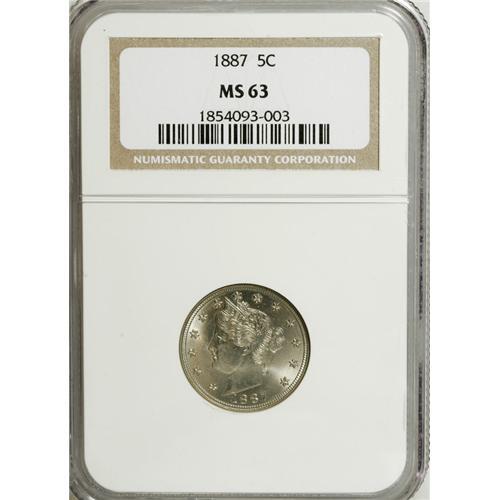<B>1887 5C MS63 NGC.</B></I> NGC Census: (64/212). PCGS Population (97/227). Mintage: 15,263,652. Numismedia Wsl. Price: $167. (#3848)<BR><BR><b>Shipping:</b> Coins & Currency (<a target="_blank" href="http://www.heritageauctions.com/common/shipping.php">view shipping information</a>)