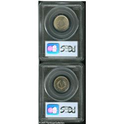 <B>1887 5C MS64 PCGS,</B></I> lustrous surfaces are overlain by streaky olive-gold toning, and exhibit softness in portions of Liberty's hair, the star centers, and leaves on the wreath; and an <B>1893 PR64 PCGS,</B></I> light gold patina with sky blue and faded violet accents. 2 Coins Lot:5879