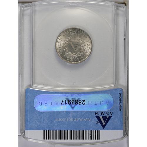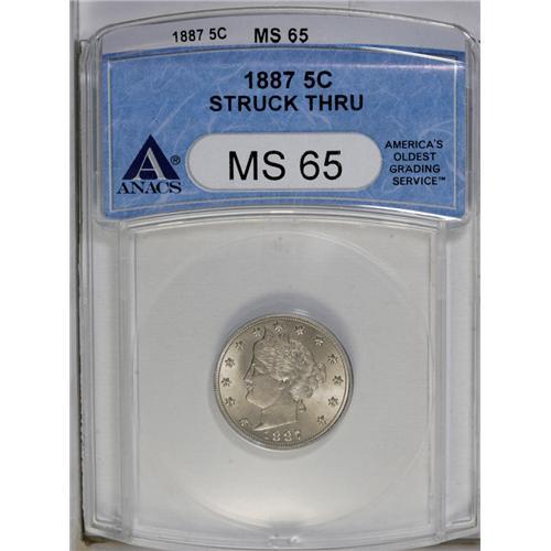 <B>1887<5C> Liberty Nickel--Struck Through Reverse--MS65 ANACS.</B></I> A solidly struck and quite lustrous rose-toned example. The holder notes a strike-through, and liquid-style depressions appear to the right of the V and near the left branch of the wreath on the reverse, though no grease is struck into the surface.