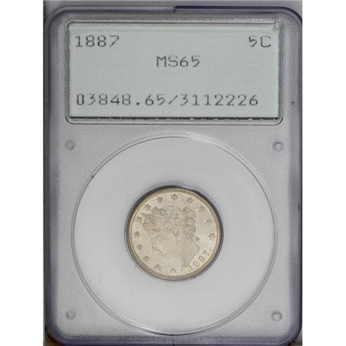<B>1887<5C> MS65 PCGS.</B></I> Hazy blue-gray toning covers the bright, semi-reflective surfaces. This Gem is sharply struck throughout with no mentionable marks. Population: 62 in 65, 11 finer (3/06). <BR><BR><B>Important notice:</B> Heritage usually auctions material at the rate of 200-250 lots per hour. On some occasions eBay Live bid software or the Internet may not be able to keep up with the pace of the auction. We recommend placing a realistic absentee bid now as insurance to avoid disappointment. Occasionally the auctioneer may eliminate or reject an eBay Live bid, and the auctioneer may also reopen a lot after the close of the eBay live bidding (usually because we missed an audience bid), and may reject your bid even if it shows you as the winning bidder. By bidding via eBay Live, you agree that Heritage may award the lot to another bidder at its sole discretion under the circumstances described above or any other reasonable circumstances. Since eBay bids are not shown to us until we open the lot on the floor, we treat those bids just like floor bids. In most cases the floor responds before the eBay bid is presented to us, due to Internet lag time, so for consistency we have made it a policy that floor bids are always considered first over tie eBay live bids. Also please note that all Heritage lots purchased through eBay Live carry a 20% Buyer's Premium. Please make sure you read the Terms and Conditions before you bid. This lot is being auctioned in conjunction with a live floor auction by Heritage Galleries & Auctioneers. All final auction and invoice information will be supplied by Heritage Galleries & Auctioneers, and all other information should be considered preliminary. Lot:917 <BR><BR><B>Winning Notification and Billing:</B> After the FINAL session in this auction is complete, Heritage will send e-mail and snail mail invoices. This process normally takes several days. All final auction and invoice information will be supplied by Heritage Galleries & Auctioneers, and all other information should be considered preliminary. <BR><BR>This auction will be conducted on a live auction floor and over the Internet through eBay Live. If you choose to place an absentee bid, please take a moment to <font color='#0000ff'><u><a href='http://pages.ebay.com/liveauctions/help/before/laabsentee.html'>learn how eBay Live absentee bidding works</a></u></font><font color='#000000'>