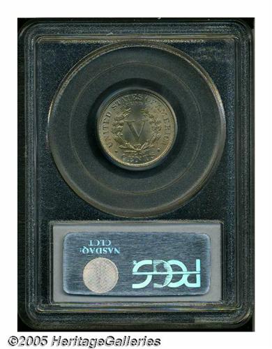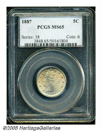 <B>1887<5C> MS65 PCGS.</B></I> Softly struck on some of the obverse stars, and on the reverse left ear of corn, but boldly detailed elsewhere, this sparkling premium Gem is lightly toned and free of post-strike distractions. A small lintmark (as struck) resides near the lower reverse rim, and extends upward across the lower part of the C in CENT. Population: 59 in 65, 10 finer (3/05).