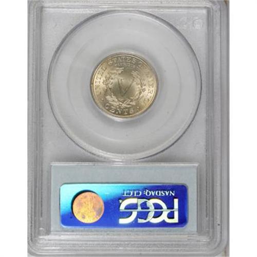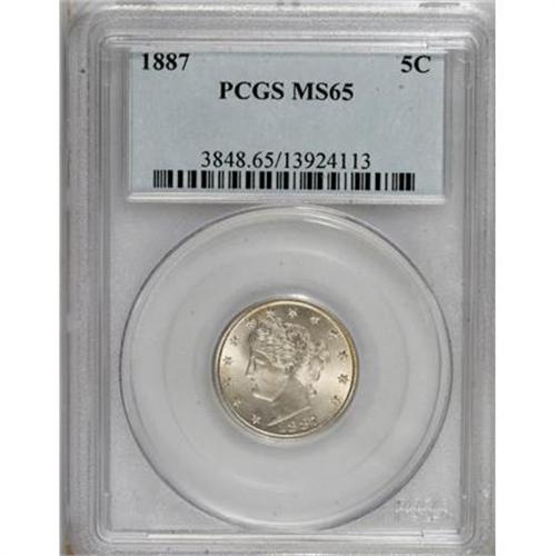 <B>1887 5C MS65 PCGS.</B></I> Sharply stuck and highly lustrous, with an intense cartwheel sheen across both sides. The obverse is essentially untoned, while the reverse displays a lovely green-gold cast. Surface marks are minimal, even for a Gem. Population: 79 in 65, 13 finer (8/07). <BR><BR><B>Coin Engraver:</B> Charles E. Barber<BR><BR><b>Shipping:</b> Coins & Currency (<a target="_blank" href="http://www.heritageauctions.com/common/shipping.php">view shipping information</a>)