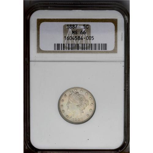 <B>1887<5C> MS66 NGC.</B></I> Lustrous surfaces re enveloped with a veneer of light reddish-gold and greenish-blue patina. Well struck, save for the wreath to the left of the bowknot. A couple of minute marks on each side do not distract in the least. Census: 17 in 66, 0 finer (2/06).