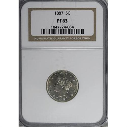 <B>1887 5C PR63 NGC.</B></I> NGC Census: (60/406). PCGS Population (110/462). Mintage: 2,960. Numismedia Wsl. Price for NGC/PCGS coin in PR63: $200. (#3885)<BR><BR><B>Coin Engraver:</B> Charles E. Barber<BR><BR><b>Shipping:</b> Coins & Currency (<a target="_blank" href="http://www.heritageauctions.com/common/shipping.php">view shipping information</a>)