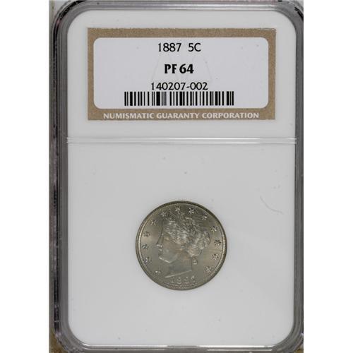 <B>1887 5C PR64 NGC.</B></I> NGC Census: (392/398). PCGS Population (282/166). Mintage: 2,960. Numismedia Wsl. Price for NGC/PCGS coin in PR64: $252. (#3885)<BR><BR><b>Shipping:</b> Coins & Currency (<a target="_blank" href="http://www.heritageauctions.com/common/shipping.php">view shipping information</a>)