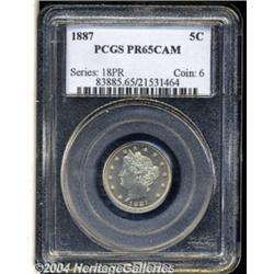 <table><tr><td><table><tr><td>1887 5C PR65 Cameo PCGS. Nicely mirrored with noticeable mint frost over the devices. The surfaces are mostly brilliant but there is just the slightest hint of light rose coloration on each side. Pinpoint striking details. <BR><BR><B>Important notice:</B> Heritage usually auctions material at the rate of 200-250 lots per hour. On some occasions eBay Live bid software or the Internet may not be able to keep up with the pace of the auction. We recommend placing a realistic absentee bid now as insurance to avoid disappointment. Occasionally the auctioneer may eliminate or reject an eBay Live bid, and the auctioneer may also reopen a lot after the close of the eBay live bidding (usually because we missed an audience bid), and may reject your bid even if it shows you as the winning bidder. By bidding via eBay Live, you agree that Heritage may award the lot to another bidder at its sole discretion under the circumstances described above or any other reasonable circumstances. Since eBay bids are not shown to us until we open the lot on the floor, we treat those bids just like floor bids. In most cases the floor responds before the eBay bid is presented to us, due to Internet lag time, so for consistency we have made it a policy that floor bids are always considered first over tie eBay live bids. Also please note that all Heritage lots purchased through eBay Live carry a 20% Buyer's Premium. Please make sure you read the Terms and Conditions before you bid. <BR><BR><B>IMPORTANT ANNOUNCEMENT ABOUT RESERVES:</B> Heritage now divulges all reserves on its web site 7 days before every auction. If you want to know whether the reserve on this lot has been met, and if not, what the reserve amount is, please visit this lot page on the HeritageCoin.com web site, or email: bid@HeritageGalleries.com </span></font></td></tr></table></td></tr></table>