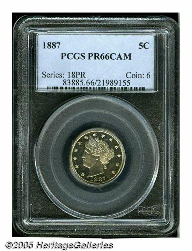 <B>1887<5C> PR66 Cameo PCGS.</B></I> Amber-tinted cameo example with excellent preservation and eye appeal. A small strike-through in the right obverse field is noted for accuracy.