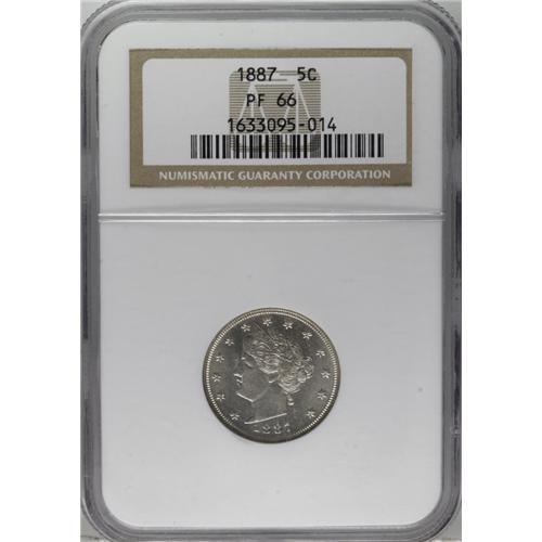 <B>1887 5C PR66 NGC.</B></I> Bright proof surfaces display a few speckles of light tan color, and crisply impressed design features. Both sides have been lovingly cared for. Census: 41 in 66, 4 finer (12/06).<BR><I>From The Paul Vine Collection.</B></I><BR><BR><b>Shipping:</b> Coin/Currency (<a target="_blank" href="http://www.heritageauctions.com/common/shipping.php">view shipping information</a>)