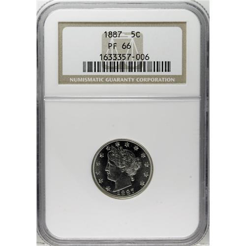 <B>1887 5C PR66 NGC.</B></I> Rather flashy and untoned. The details present on Liberty's hair and the wreath are exceptionally fine. Census: 41 in 66, 4 finer (10/06).<BR><BR><b>Shipping:</b> Coin/Currency (<a target="_blank" href="http://www.heritageauctions.com/common/shipping.php">view shipping information</a>)