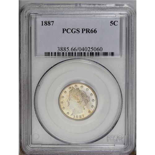<B>1887<5C> PR66 PCGS.</B></I> Variegated yellow-gold and ice-blue patina bathe luminous surfaces that are devoid of mentionable marks. The design features are well impressed. Population: 39 in 66, 4 finer (3/06). <BR><BR><B>Important notice:</B> Heritage usually auctions material at the rate of 200-250 lots per hour. On some occasions eBay Live bid software or the Internet may not be able to keep up with the pace of the auction. We recommend placing a realistic absentee bid now as insurance to avoid disappointment. Occasionally the auctioneer may eliminate or reject an eBay Live bid, and the auctioneer may also reopen a lot after the close of the eBay live bidding (usually because we missed an audience bid), and may reject your bid even if it shows you as the winning bidder. By bidding via eBay Live, you agree that Heritage may award the lot to another bidder at its sole discretion under the circumstances described above or any other reasonable circumstances. Since eBay bids are not shown to us until we open the lot on the floor, we treat those bids just like floor bids. In most cases the floor responds before the eBay bid is presented to us, due to Internet lag time, so for consistency we have made it a policy that floor bids are always considered first over tie eBay live bids. Also please note that all Heritage lots purchased through eBay Live carry a 20% Buyer's Premium. Please make sure you read the Terms and Conditions before you bid. This lot is being auctioned in conjunction with a live floor auction by Heritage Galleries & Auctioneers. All final auction and invoice information will be supplied by Heritage Galleries & Auctioneers, and all other information should be considered preliminary. Lot:991 <BR><BR><B>Winning Notification and Billing:</B> After the FINAL session in this auction is complete, Heritage will send e-mail and snail mail invoices. This process normally takes several days. All final auction and invoice information will be supplied by Heritage Galleries & Auctioneers, and all other information should be considered preliminary. <BR><BR>This auction will be conducted on a live auction floor and over the Internet through eBay Live. If you choose to place an absentee bid, please take a moment to <font color='#0000ff'><u><a href='http://pages.ebay.com/liveauctions/help/before/laabsentee.html'>learn how eBay Live absentee bidding works</a></u></font><font color='#000000'>