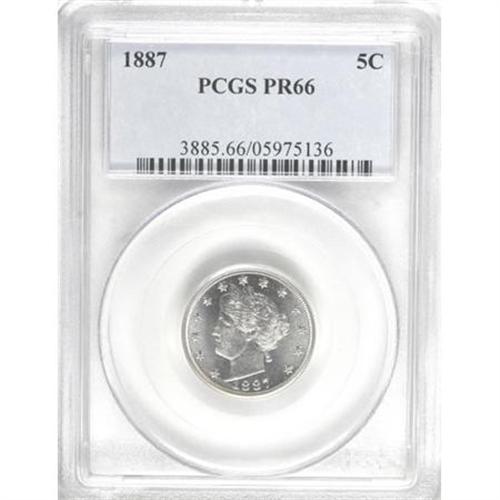 <B>1887 5C PR66 PCGS.</B></I> A brilliant, dazzlingly reflective proof, essentially untoned and free of bothersome contact marks or hairlines. Boldly struck and impressively preserved. Population: 41 in 66, 4 finer (8/07).<BR><BR><B>Coin Engraver:</B> Charles E. Barber<BR><BR><b>Shipping:</b> Coins & Currency (<a target="_blank" href="http://www.heritageauctions.com/common/shipping.php">view shipping information</a>)