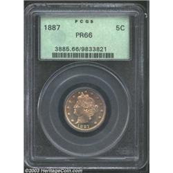 <TABLE cellSpacing=0 cellPadding=0 width="100%" bgColor=#000000 border=0><TBODY><TR><TD width="100%"><TABLE cellSpacing=1 cellPadding=3 width="100%" border=0><TBODY><TR><TD width="100%" bgColor=#79735c><FONT face=arial color=#ffffff size=3><B>Description</B> </FONT></TD></TR><TR><TD width="100%" bgColor=#ffffff><FONT face=arial size=2><B>1887 5C PR66 PCGS.</B></I> Champagne and amber colors dominate on each side of this well struck Gem, which is devoid of contact marks or hairlines. A impressively preserved example, with better than average eye appeal. Population: 34 in 66, 3 finer (4/03). </FONT></TD></TR></TBODY></TABLE></TD></TR></TBODY></TABLE><BR><A name=PricesRealized></A><TABLE cellSpacing=0 cellPadding=0 width="100%" bgColor=#000000 border=0><TBODY><TR><TD width="100%"><TABLE cellSpacing=1 cellPadding=3 width="100%" border=0><TBODY><TR><TD width="100%" bgColor=#79735c><A name=PR><FONT face=arial color=#ffffff size=3><B>Previous Prices from Heritage Auctions</B> </FONT></A></TD></TR><TR><TD bgColor=#f6f6ed><TABLE cellSpacing=0 cellPadding=0 width="100%" border=1><TBODY><TR><TD align=middle width="33%"><B>Date</B></TD><TD align=middle width="33%"><B>Service</B></TD><TD align=middle width="33%"><B>Price</B></TD></TR><TR bgColor=whitesmoke><TD width="33%"><B>03/01/1997</B></TD><TD width="33%">PCGS</TD><TD width="33%">$550.00</TD></TR><TR bgColor=whitesmoke><TD width="33%"><B>01/11/2003</B></TD><TD width="33%">NGC</TD><TD width="33%">$690.00</TD></TR><TR bgColor=whitesmoke><TD width="33%"><B>04/09/2002</B></TD><TD width="33%">NGC</TD><TD width="33%">$563.50</TD></TR><TR bgColor=whitesmoke><TD width="33%"><B>01/16/2001</B></TD><TD width="33%">NGC</TD><TD width="33%">$525.00</TD></TR><TR bgColor=whitesmoke><TD width="33%"><B>09/26/1998</B></TD><TD width="33%">NGC</TD><TD width="33%">$603.75</TD></TR><TR bgColor=whitesmoke><TD width="33%"><B>08/01/1999</B></TD><TD width="33%">NGC</TD><TD width="33%">$633.00</TD></TR></TBODY></TABLE></TD></TR><TR><TD bgColor=#ffffff><FONT face=arial size=1 ?>PLEASE NOTE: All prices realized reflect the final hammer price PLUS the buyer's premium in auctions that charge a buyer's premium. Each item has a notation at the top of the listing indicating whether that lot included a buyer's premium. Example: A item that sells with a final hammer price of $100 and a 20% buyer's premium will display with a price realized of $120. All information listed is intended to be as accurate as possible, but errors are possible. Please use this guide carefully and inform us of any inaccuracies. </FONT></TD></TR></TBODY></TABLE></TD></TR></TBODY></TABLE><BR><TABLE cellSpacing=0 cellPadding=0 width="100%" bgColor=#000000 border=0><TBODY><TR><TD width="100%"><TABLE cellSpacing=1 cellPadding=3 width="100%" border=0><TBODY><TR><TD width="100%" bgColor=#79735c colSpan=6><FONT face=arial color=#ffffff size=3><B>Price Guide*</B> </FONT></TD></TR><TR bgColor=#f6f6ed><TD align=middle><B>Grade</B> </TD><TD align=middle><B>Coin World<BR>(Trends)</B> </TD><TD align=middle><B>Numismedia<BR>Retail</B> </TD><TD align=middle><B>Numismedia<BR>Wholesale</B> </TD><TD align=middle><B>Coin<BR>Universe</B> </TD><TD align=middle><B>Heritage<BR>Value Index</B> </TD></TR><TR bgColor=#ffffff><TD align=middle>65</TD><TD align=right>---</TD><TD align=right>$600.00</TD><TD align=right>$480.00</TD><TD align=right>$600.00</TD><TD align=right>$371.83</TD></TR><TR style="FONT-WEIGHT: bold" bgColor=#cccfdd><TD align=middle>66</TD><TD align=right>---</TD><TD align=right>---</TD><TD align=right>$825.00</TD><TD align=right>$900.00</TD><TD align=right>$702.50</TD></TR><TR bgColor=#ffffff><TD align=middle>67</TD><TD align=right>---</TD><TD align=right>---</TD><TD align=right>---</TD><TD align=right>---</TD><TD align=right>---</TD></TR><TR bgColor=#ffffff><TD colSpan=6><FONT size=1>*All information listed is intended to be as accurate as possible, but errors are possible. No item may be returned or refused based on this information which is provided as a service to our customers. You should contact each pricing source directly to determine the accuracy of this information. </FONT></TD></TR></TBODY></TABLE></TD></TR></TBODY></TABLE><BR><TABLE cellSpacing=0 cellPadding=0 width="100%" bgColor=#000000 border=0><TBODY><TR><TD width="100%"><TABLE cellSpacing=1 cellPadding=3 width="100%" border=0><TBODY><TR><TD width="100%" bgColor=#79735c><FONT face=arial color=#ffffff size=3><B>Population Guide</B> </FONT></TD></TR><TR bgColor=#ffffff><TD align=middle><!-- Begin Output of Population Grid--><TABLE cellSpacing=0 cellPadding=0 width="100%" border=0><TBODY><TR><TD vAlign=center><TABLE cellSpacing=0 width="100%" border=1 cellsadding="3"><TBODY><TR><TD vAlign=center><TABLE cellSpacing=0 cellPadding=3 width="100%" border=1><TBODY><TR><TD vAlign=center align=middle bgColor=#f0f1e8 colSpan=2 <CENTER><FONT face=Arial size=2><B>PCGS Pop </B></FONT><CENTER></CENTER></TD><TD vAlign=center align=middle bgColor=#f0f1e8 colSpan=2><CENTER><FONT face=Arial size=2><B>NGC Pop</B></CENTER></FONT></TD></TR><TR><TD vAlign=center><FONT face=Arial size=2>(66)</FONT> </TD><TD vAlign=center align=right><FONT face=Arial size=2>34</FONT> </TD><TD vAlign=center><FONT face=Arial size=2>(66)</FONT> </TD><TD vAlign=center align=right><FONT face=Arial size=2>44</FONT> </TD></TR><TR><TD vAlign=center><FONT face=Arial size=2>(>66)</FONT> </TD><TD vAlign=center align=right><FONT face=Arial size=2>3</FONT> </TD><TD vAlign=center><FONT face=Arial size=2>(>66)</FONT> </TD><TD vAlign=center align=right><FONT face=Arial size=2>2</FONT> </TD></TR></TBODY></TABLE></TD></TR></TBODY></TABLE></TD></TR></TBODY></TABLE><!-- End Output of Population Grid--> Important notice: Heritage usually auctions material at the rate of 200-250 lots per hour. On some occasions eBay Live bid software or the Internet may not be able to keep up with the pace of the auction. We recommend placing a realistic absentee bid now as insurance to avoid disappointment. Occasionally the auctio