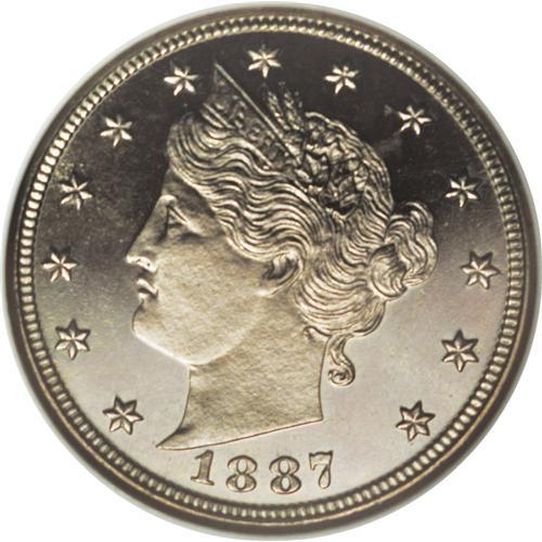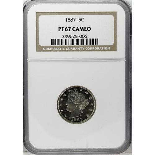 <B>1887 5C PR67 Cameo NGC.</B></I> Silky-smooth with a modest, yet appreciable cameo effect. Both sides are free of noteworthy distractions. The obverse exhibits a soft sky-blue color, while the reverse is ice-blue with a trace of golden-red. Highly appealing with sharply impressed features. Census: 3 in 67 Cameo, 0 finer (12/06).<BR><I>From The Paul Vine Collection.</B></I><BR><BR><b>Shipping:</b> Coin/Currency (<a target="_blank" href="http://www.heritageauctions.com/common/shipping.php">view shipping information</a>)