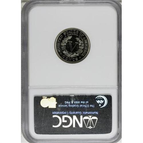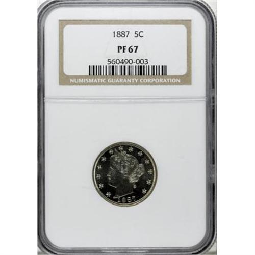 <B>1887 5C PR67 NGC.</B></I> The surfaces are almost perfect on this flashy proof Liberty nickel. Brilliant throughout, the fields are deeply mirrored and the devices display pinpoint striking definition. One of only eight coins to have been so graded by the two major services with none higher (11/07).<BR><BR><B>Coin Engraver:</B> Charles E. Barber<BR><BR><b>Shipping:</b> Coins & Currency (<a target="_blank" href="http://www.heritageauctions.com/common/shipping.php">view shipping information</a>)