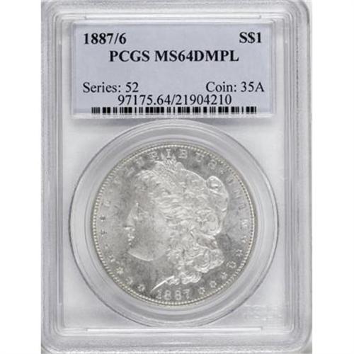 <B>1887/6 $1 MS64 Deep Mirror Prooflike PCGS.</B></I> VAM-2. A Top 100 Variety. The curve of the base of the underdigit 6 is seen on each side of the 7. This important Guide Book variety is scarce in Mint State, and rare with deeply mirrored fields. This faintly toned near-Gem is alertly struck and only lightly abraded. Population: 7 in 64, 3 finer (10/07).<BR><BR><b>Shipping:</b> Coins & Currency (<a target="_blank" href="http://www.heritageauctions.com/common/shipping.php">view shipping information</a>)