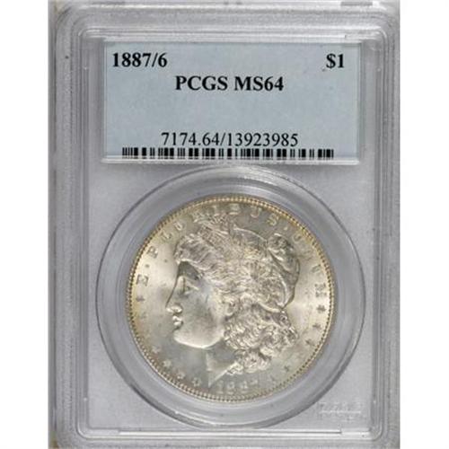 <B>1887/6 $1 MS64 PCGS.</B></I> VAM-2. A Top 100 Variety. Booming luster and light lemon toning endow this suitably struck overdate dollar. Only faint marks near the eye and right side stars deny an even higher grade.<BR><BR><B>Coin Engraver:</B> George T. Morgan<BR><BR><b>Shipping:</b> Coins & Currency (<a target="_blank" href="http://www.heritageauctions.com/common/shipping.php">view shipping information</a>)