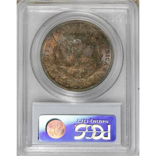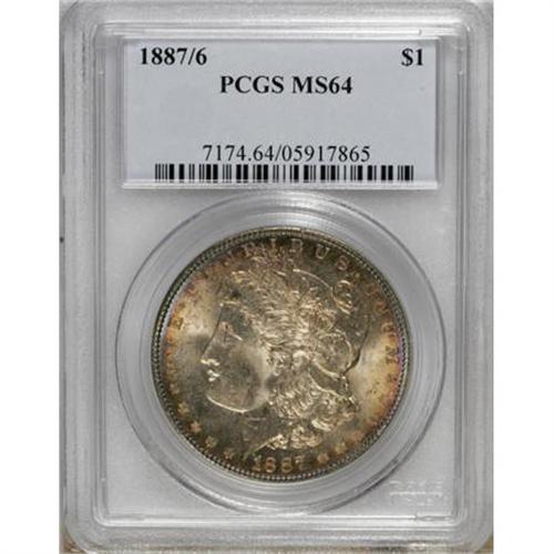 <B>1887/6 $1 MS64 PCGS.</B></I> VAM-2. A Top 100 Variety. Remarkable orange-gold, plum-red, and electric-blue illuminate the obverse, while the reverse is fully patinated in peach, sky-blue, and rose-red. Well struck and lustrous with a clean cheek and smooth fields.<BR><BR><B>Coin Engraver:</B> George T. Morgan<BR><BR><b>Shipping:</b> Coins & Currency (<a target="_blank" href="http://www.heritageauctions.com/common/shipping.php">view shipping information</a>)