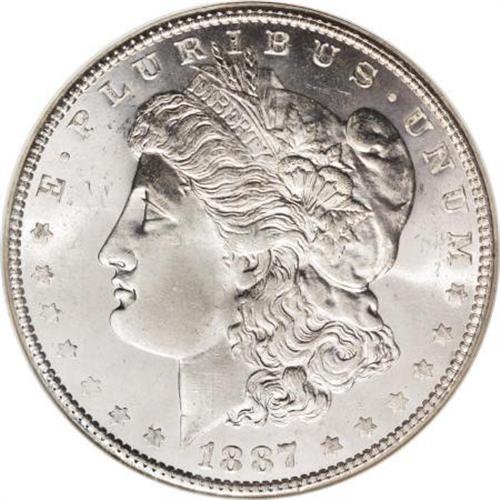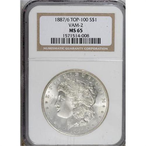 <B>1887/6 $1 MS65 NGC.</B></I> VAM-2. A Top 100 Variety. This virtually untoned better variety Morgan dollar has scintillating cartwheel sheen, and the surfaces lack the scuffs generally encountered on this issue. Nicely struck, and worthy of an advanced <I>Guide Book </B></I>collection. Census: 75 in 65, 5 finer (10/07).<BR><BR><B>Coin Engraver:</B> George T. Morgan<BR><BR><b>Shipping:</b> Coins & Currency (<a target="_blank" href="http://www.heritageauctions.com/common/shipping.php">view shipping information</a>)