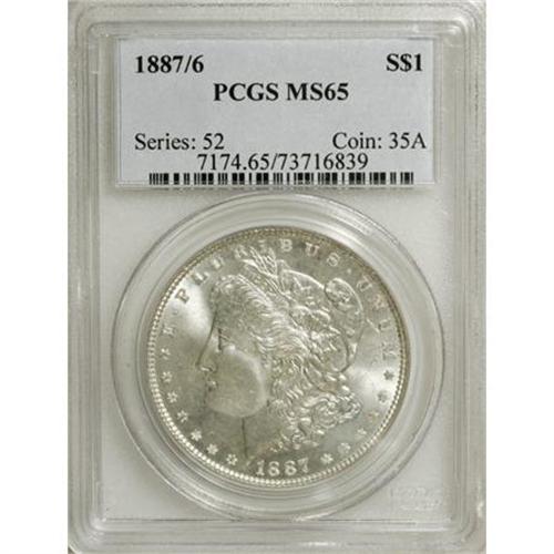 <B>1887/6 $1 MS65 PCGS.</B></I> Bright and satiny, the surfaces of this piece are unusually clean for this normally troublesome issue. Examination with a loupe reveals the distinct lunule of a previously punched 6 at the bottom of the 7. According to Bowers, slightly less than one half percent of the mintage of the 1887 shows this underdigit. Population: 100 in 65, 4 finer (6/07).<BR><I>From the Reuben Reinstein Collection.</B></I><BR><BR><b>Shipping:</b> Coins & Currency (<a target="_blank" href="http://www.heritageauctions.com/common/shipping.php">view shipping information</a>)