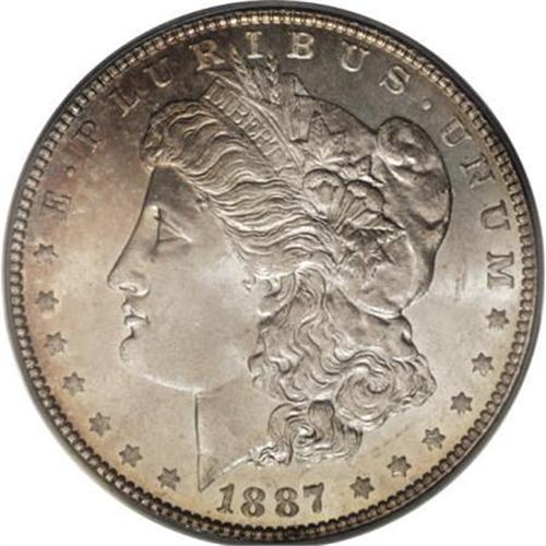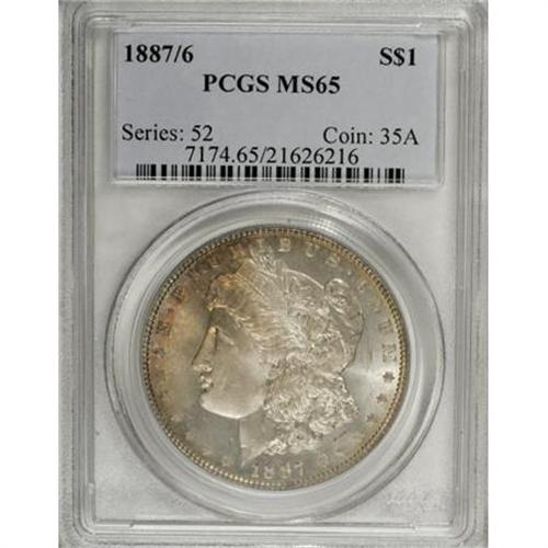 <B>1887/6 $1 MS65 PCGS.</B></I> VAM-2. A Top 100 Variety. The bottom of the lower loop of the underlying 6 is visible as a curved line through the lower stem of the 7. Whispers of golden-tan, lavender, and electric-blue toning gravitate to portions of the borders of this Gem example. Generally well struck, with pleasing luster. A few grade-consistent marks do not disturb. In their 1996 VAM reference book, Michael Fey and Jeff Oxman contend that "this issue's popularity has increased to the point it's now considered an integral part of a complete Morgan dollar set."<BR><I>From The Arnold & Harriet Collection, Part Two.</B></I><BR><BR><B>Coin Engraver:</B> George T. Morgan<BR><BR><b>Shipping:</b> Coins & Currency (<a target="_blank" href="http://www.heritageauctions.com/common/shipping.php">view shipping information</a>)