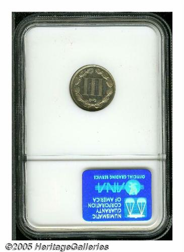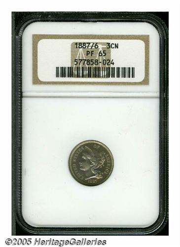 <B>1887/6<3CN> PR65 NGC.</B></I> Colonial revival blue mingles with peach and violet on this example. Though as usual the dentils could be stronger, the strike is above average.