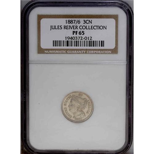 <B>1887/6<3CN> PR65 NGC.</B></I> Pleasing delicate champagne iridescence. Vestiges of the 6 beneath the 7 are clear and prominent. The devices are frosty and the fields are nicely reflective. Faint clash marks can be seen on the reverse, an unusual feature for a proof impression.