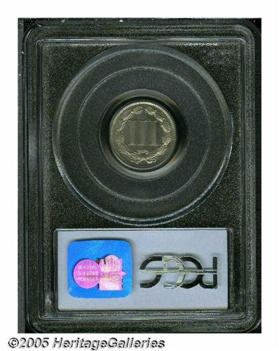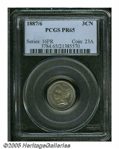 <B>1887/6<3CN> PR65 PCGS.</B></I> Original variegated dove-gray color enriches this meticulously struck and pleasing Gem. A tiny spot at the base of Liberty's hair is the only perceptible imperfection.
