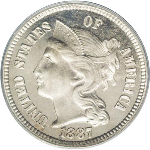 <B>1887/6 3CN PR66 Cameo PCGS.</B></I> The overdate is quite clear. This is a luminous Premium Gem with light Cameo contrast. The surfaces are pleasing with pale gold toning, and exhibit sharply struck design elements; all of the lines on the III are fully delineated. There are no significant contact marks or hairlines. A couple of mint-made lint marks are located in the right (facing) reverse field. A tiny spot below the digit 1 is the only blemish. Population: 17 in 66, 3 finer (1/06).