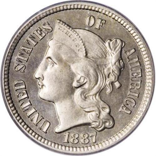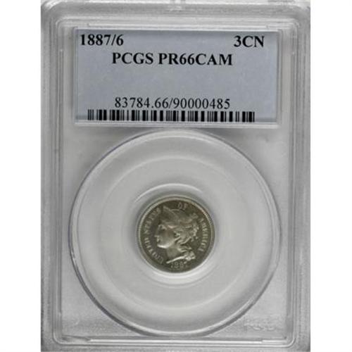 <B>1887/6 3CN PR66 Cameo PCGS.</B></I> A plain overdate distinguishes this interesting later three cent nickel issue, one of the few proof overdates struck by the United States. This lovely specimen offers light nickel-gray surfaces on both sides with subtle steel-blue accents. Population: 25 in 66 Cameo, 4 finer (8/07).<BR><BR><b>Shipping:</b> Coins & Currency (<a target="_blank" href="http://www.heritageauctions.com/common/shipping.php">view shipping information</a>)