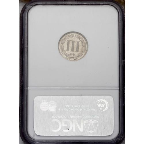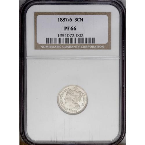 <B>1887/6<3CN> PR66 NGC.</B></I> Vestiges of the 6 beneath the 7 are clear and prominent. Whispers of light tan-gold color overlay luminous surfaces that exhibit a cameo-like effect when the coin is tilted beneath a light source. The design features are exquisitely brought up, including full definition in the lines of the III. There are no significant contact marks or spots to report. A small U-shaped lint mark is located beneath the jaw, and some light clash marks are seen on the reverse. Census: 74 in 66, 2 finer (2/06).