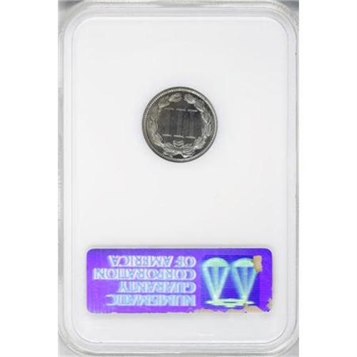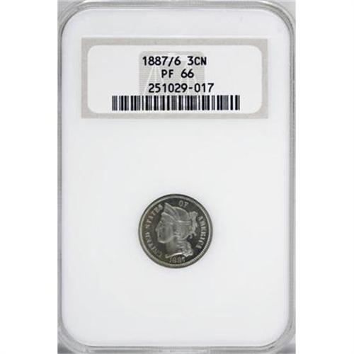 <B>1887/6 3CN PR66 NGC.</B></I> The 6 underdigit is plain. A razor-sharp and exquisite Premium Gem with original light olive-gray toning. Boldly clashed near the third column of the denomination. Encapsulated in a former generation holder.<BR><BR><B>Coin Engraver:</B> James B. Longacre<BR><BR><b>Shipping:</b> Coins & Currency (<a target="_blank" href="http://www.heritageauctions.com/common/shipping.php">view shipping information</a>)