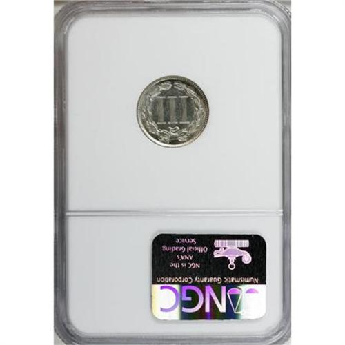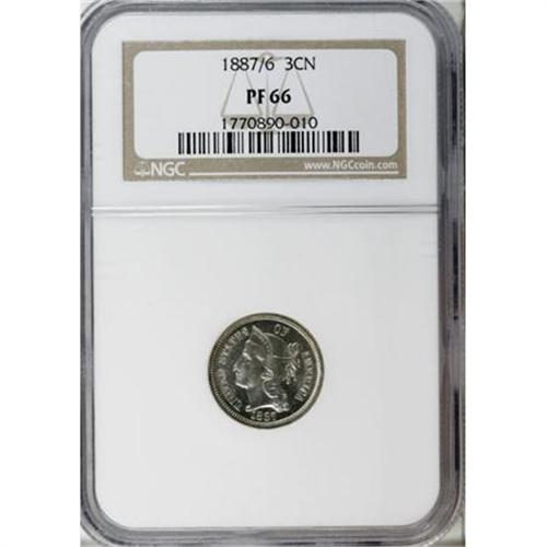 <B>1887/6 3CN PR66 NGC.</B></I> Delicate golden accents grace the shining surfaces of this overdated Premium Gem proof. The devices show attractive detail, and the fields are clean. NGC has graded only two finer representatives (1/08).<BR><BR><B>Coin Engraver:</B> James B. Longacre<BR><BR><b>Shipping:</b> Coins & Currency (<a target="_blank" href="http://www.heritageauctions.com/common/shipping.php">view shipping information</a>)