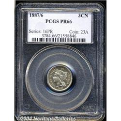 <B>1887/6<3CN> PR66 PCGS.</B></I> Breen-2453. Traces of the 6 from the original logotype are present on the left side of the 7 in the date. Deeply mirrored, flashy fields with contrasting mint frost on the devices. A superior example of this unusual overdated proof, one of only four overdated proofs known to have been produced in the 19th century. Population: 45 in 66, 5 finer (3/04). <BR><BR><B>Important notice:</B> Heritage usually auctions material at the rate of 200-250 lots per hour. On some occasions eBay Live bid software or the Internet may not be able to keep up with the pace of the auction. We recommend placing a realistic absentee bid now as insurance to avoid disappointment. Occasionally the auctioneer may eliminate or reject an eBay Live bid, and the auctioneer may also reopen a lot after the close of the eBay live bidding (usually because we missed an audience bid), and may reject your bid even if it shows you as the winning bidder. By bidding via eBay Live, you agree that Heritage may award the lot to another bidder at its sole discretion under the circumstances described above or any other reasonable circumstances. Since eBay bids are not shown to us until we open the lot on the floor, we treat those bids just like floor bids. In most cases the floor responds before the eBay bid is presented to us, due to Internet lag time, so for consistency we have made it a policy that floor bids are always considered first over tie eBay live bids. Also please note that all Heritage lots purchased through eBay Live carry a 20% Buyer's Premium. Please make sure you read the Terms and Conditions before you bid.